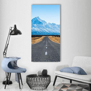 This captivating vertical canvas art features a serene mountain road leading into the snowy peaks beneath a clear sky. With its modern, minimalist design and an expansive mood, it's perfect for adding a touch of nature and tranquility to your space.