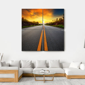 This stunning landscape artwork captures a serene road at sunset, framed by mountains and dotted with trees. The vibrant palette of orange, yellow, and blue evokes a sense of hope and adventure, making it a captivating addition to your decor.