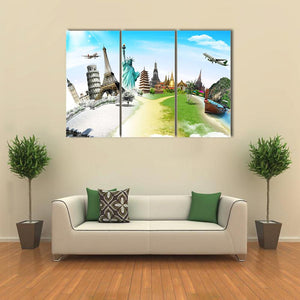 Celebrate your love for travel with this adventurous canvas art featuring famous landmarks like the Eiffel Tower and Statue of Liberty. The vibrant palette of blue, green, and yellow evokes a sense of wanderlust, making it a perfect addition to any space that needs a touch of inspiration.