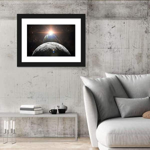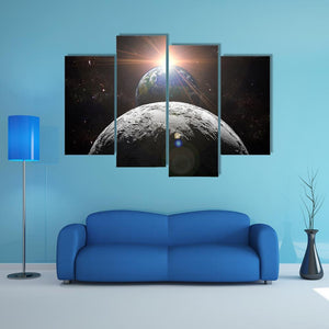 This canvas depicts Earth, the Moon, and a bright Sun in a realistic, dramatic scene that reads as both cosmic and serene. The composition emphasizes depth and perspective, with stars in the background, visible moon craters, and a sunlit lens flare — a strong fit for modern living spaces and home offices.