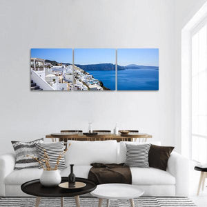 A panoramic view of Santorini’s white buildings with blue accents cascading down a steep hillside toward a calm blue sea. The realistic, sunlit scene feels serene and picturesque, with distant hills adding depth — suited to modern or coastal-inspired rooms.