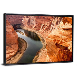 This landscape artwork captures the majestic curves of the Colorado River as it meanders through a canyon. With a serene palette of red, orange, green, and blue, it brings a sense of vastness to any room.