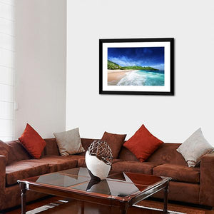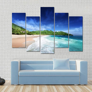 Bring the beauty of a tropical beach into your home with this serene canvas art. Featuring vibrant ocean waves and lush green hills under a clear blue sky, it captures an idyllic moment in nature perfect for any wall décor.