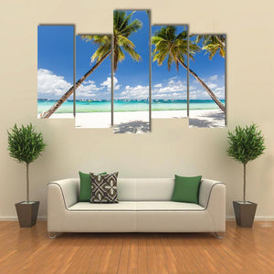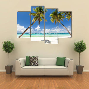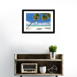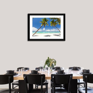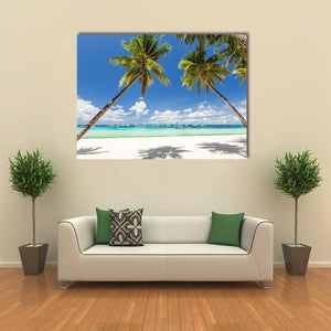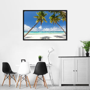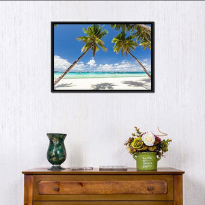 This canvas features a serene tropical beach scene with palm trees casting shadows on soft sand. The calming palette of blues and whites evokes a vacation vibe, making it a perfect addition to any coastal or nature-inspired décor.
