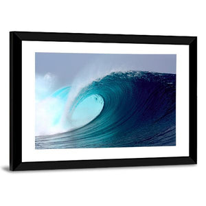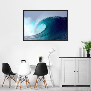 A close-up ocean wave captured in a dynamic curve, with spray from the crest and a palette of blue, teal, and white that reads powerful and energetic. The modern piece suits coastal or tropical-themed rooms and contemporary living spaces seeking bold natural motion on the wall.