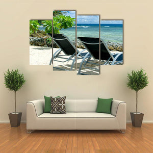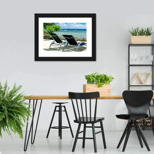 Bring the essence of a tranquil beach vacation into your space with this vivid canvas artwork. Featuring serene lounge chairs by the ocean and a clear blue sky, it's a perfect escape for your walls.