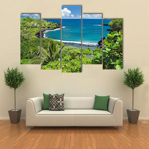 This beautiful canvas captures a serene view of Maui's black sand beach and vibrant tropical foliage. The photorealistic artwork showcases white waves and lush, green plants, creating a lively yet tranquil feel, perfect for any beach lover's decor.