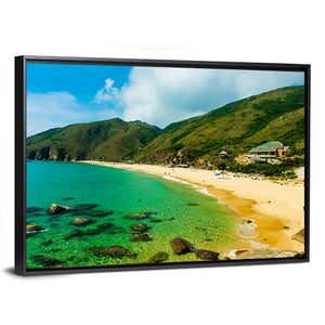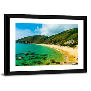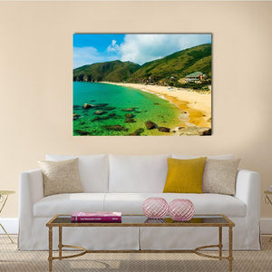 Ky Co Beach, Vietnam captures a wide aerial view of a tropical beach with clear turquoise water, green hills and resort-like buildings on the hillside. The scene feels serene and inviting, with visible rocks beneath the shallow water and gentle waves along the tan shore. Works well with coastal or modern room decor.