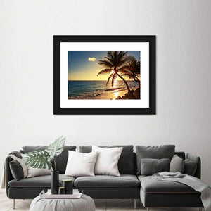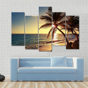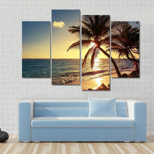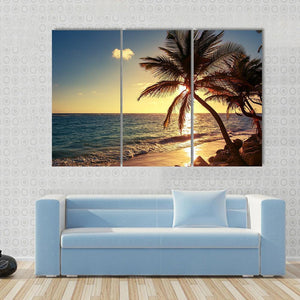 Bring the calm of a tropical beach into your space with this stunning canvas featuring palm trees against a serene sunset. Its realistic details create a peaceful atmosphere, perfect for any room.