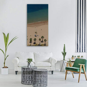 Aerial view of a sandy beach with palm trees, sunbathers, and umbrellas rendered in soft blues, tans, greens, and white. The modern, realistic scene feels peaceful and sunny, a quiet vacation moment captured on canvas. It suits coastal or contemporary rooms as relaxed wall decor.