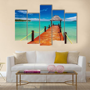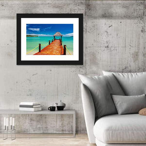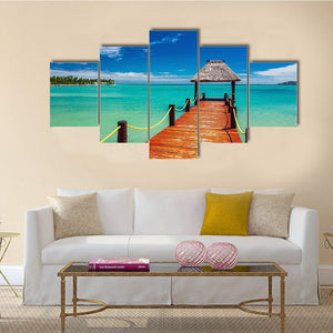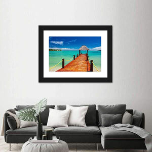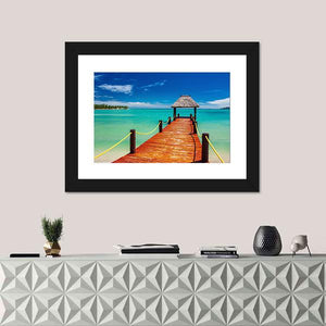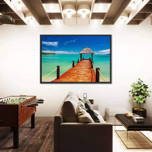 This canvas art features a serene view of a red wooden jetty leading into a turquoise ocean, complemented by a charming hut at its end. With its inviting tropical vibe, it adds a touch of charm to any space.
