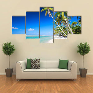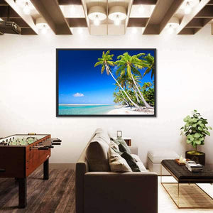 A realistic view of a tropical beach in French Polynesia with turquoise water, white sand and lush palm trees under a clear blue sky. The wide-angle composition and calm color palette create a serene, vacation-like mood that works well in modern living rooms or bedrooms.