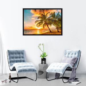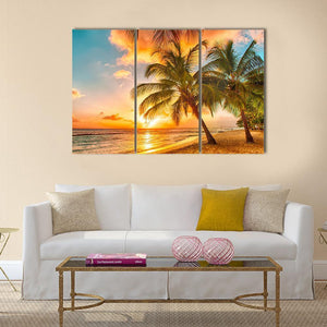 This stunning canvas features a tranquil beach scene with palm trees and a sunset over the ocean. Its warm palette of oranges, blues, and greens creates a serene, tropical atmosphere that enhances any space.