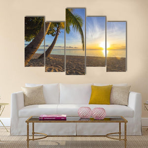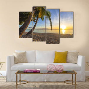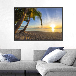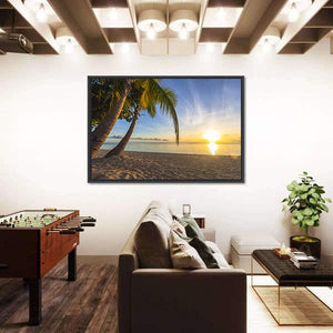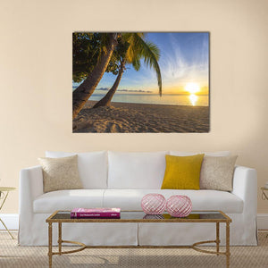This canvas wall art captures a serene beach scene in Fiji, featuring palm trees under a tranquil ocean sunset. With its photorealistic style and calming color palette, it enhances any space, inviting relaxation and peace.
