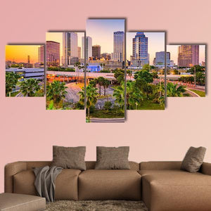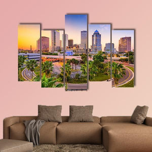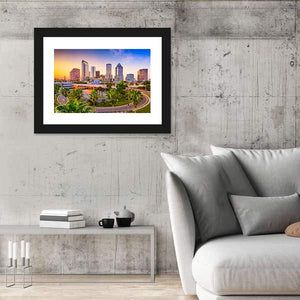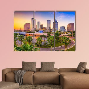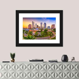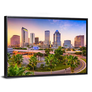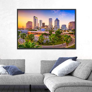 A photorealistic cityscape of Tampa’s downtown at sunset, featuring palm trees, numerous skyscrapers and a circular road in the foreground. Blues, oranges, greens and gray tones create a peaceful yet vibrant urban atmosphere. Suited to modern home décor and living rooms that want a travel-inspired focal piece.