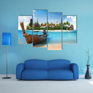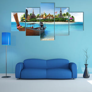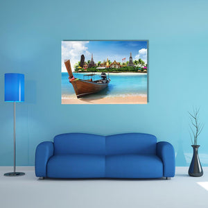 This canvas art captures a serene tropical island scene featuring a traditional longtail boat and beautiful Thai temples. The colors evoke a peaceful, exotic vibe, making it an inviting addition to any room.