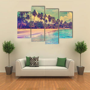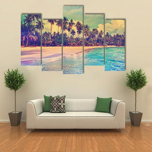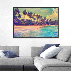 This canvas wall art captures the serene beauty of palm trees swaying on a tropical beach under a vibrant sky. The stylized colors and wispy clouds create a relaxing atmosphere, perfect for adding a touch of nature to your decor.
