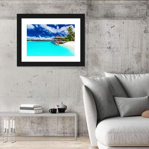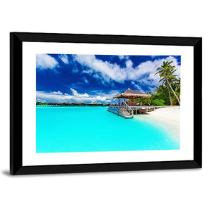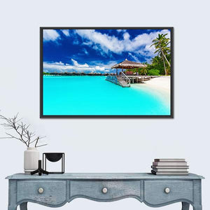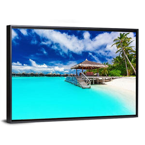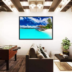 This canvas art captures a serene tropical beach scene, featuring a charming overwater bungalow and swaying palm trees. The idyllic blue and turquoise waters invite a sense of vacation and tranquility, making it an excellent choice for any nature lover.