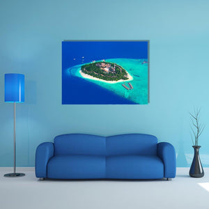 This canvas wall art features a breathtaking aerial view of a tropical island in the Maldives, showcasing the serene beauty of the ocean, overwater bungalows, and a white sand beach. With vibrant blues and greens, it creates a tranquil atmosphere for any space.