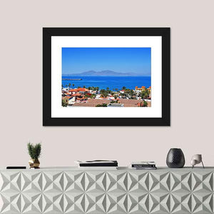 This canvas art captures a serene view of Lobos Island from Corralejo, showcasing a tranquil coastal town set against distant mountains and a vibrant ocean. The bright colors of blue, orange, and green create a peaceful atmosphere, making it a beautiful addition to any space.