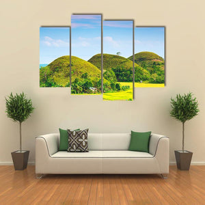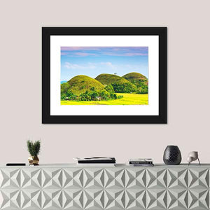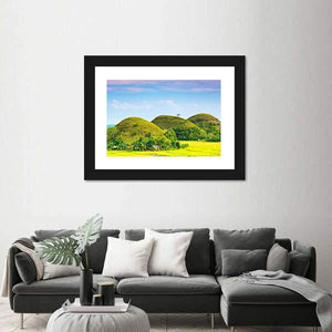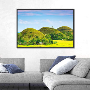 View of the Chocolate Hills shows a vibrant, realistic landscape of cone-shaped green hills and rice paddies beneath a bright blue sky with fluffy white clouds. The rule-of-thirds composition creates a serene, picturesque mood that suits modern room decor and nature-inspired spaces.