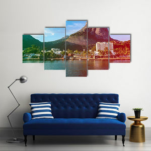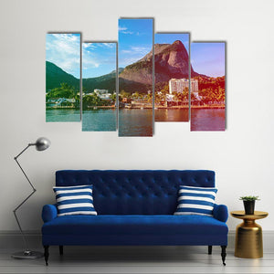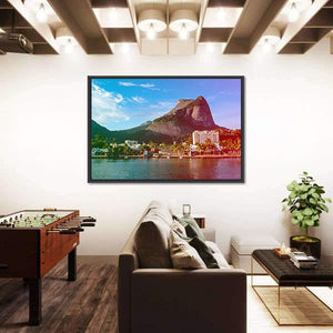 A view of the Gavea Stone and the shoreline at Rio de Janeiro, showing a mountain peak, buildings along the water and boats beneath a sky dotted with clouds. The modern, colorful print uses blues, greens and browns for a serene yet vibrant scenic feel. Suited to modern living rooms or rooms seeking nature-inspired wall decor.