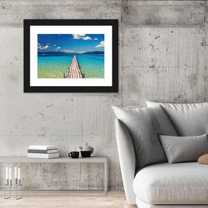 This serene canvas art features a wooden pier extending into a tranquil tropical ocean. The rich blues and turquoises, combined with sunlight dappling through clear water, evoke a peaceful and inviting atmosphere, perfect for enhancing any room's decor.