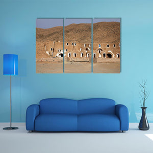 This canvas art depicts traditional stone buildings nestled in an arid desert landscape. With its rustic charm and earthy palette of tans and browns, it evokes a sense of ancient serenity, perfect for enhancing your living space.