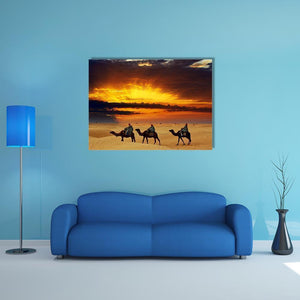 This landscape art captures a serene desert scene featuring camels and riders against a stunning sunset backdrop. The warm palette of oranges and yellows, along with dramatic clouds, evokes a sense of vast adventure, making it a striking addition to any space.
