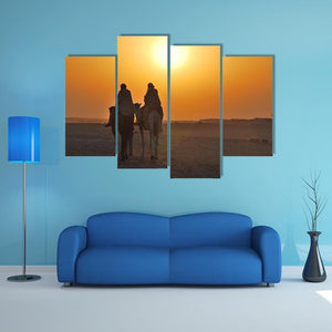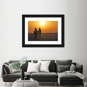 This canvas wall art beautifully captures two camels riding towards the sun in a serene desert landscape. The warm palette of orange and yellow, along with the silhouettes of the riders, evokes a sense of adventure and tranquility.