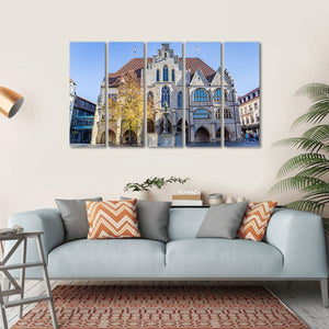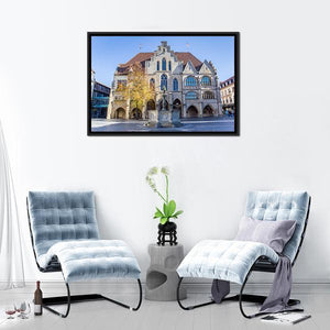 This canvas features the historic City Hall in Hildesheim, showcasing a stunning blend of Gothic architecture set against a backdrop of autumn leaves and a vibrant fountain. The bright colors of tan, blue, and green create a lively daytime atmosphere, making it a unique addition to your wall decor.