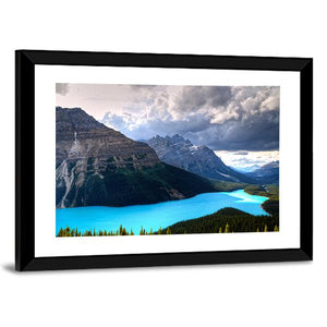 Experience the serene beauty of Peyto Lake, nestled in the Canadian Rockies. This landscape canvas features majestic mountains, a peaceful turquoise lake, and dramatic cloud formations, bringing a sense of awe to any space.