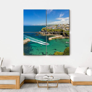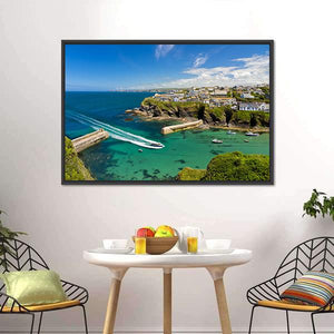 Capture the spirit of a coastal town with this vibrant canvas art featuring the harbor of Port Isaac. The photorealistic view showcases clear turquoise waters, a speed boat creating a wake, and rocky cliffs dotted with charming buildings under a bright blue sky, evoking a serene yet adventurous atmosphere.