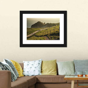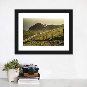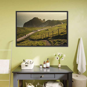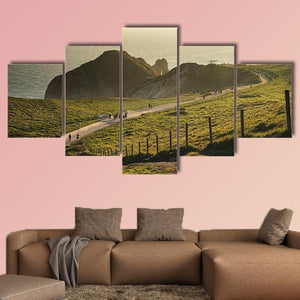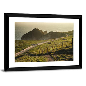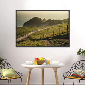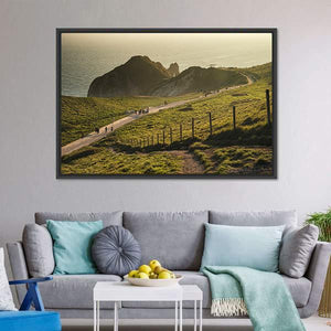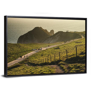 Landscape Of Durdle Door Canvas Wall Art shows coastal cliffs, the ocean, a pathway with hikers and a fence, captured in a nature-photography style. The image uses green, blue, tan and gold tones and a rule-of-thirds composition to create a serene, bright, peaceful atmosphere. It suits modern living spaces and other room decor where a calm landscape is welcome.