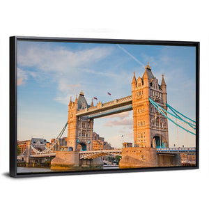 Experience the iconic Tower Bridge in London with this striking canvas wall art. Captured in a serene daytime setting, the vibrant blue and gold palette offers a calm atmosphere, with details like boats on the River Thames and hint of clouds in the sky.