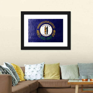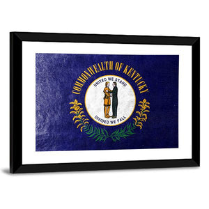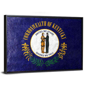 This canvas art features the Kentucky state seal in a proud and formal design. The graphic representation includes a symmetrical composition with blue and white tones, enhanced by gold and green accents, making it a striking piece for any space.