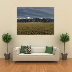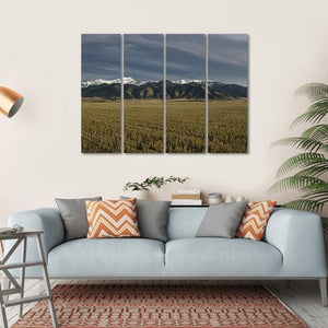 This captivating artwork features the serene Bridger Mountains along with expansive fields and a cloudy sky. The natural palette of greens, browns, and grays evokes a sense of vastness and tranquility, making it an inviting addition to any space.