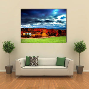 Capture the essence of autumn with this vibrant landscape depicting a farmhouse nestled among rolling hills adorned in red and orange foliage. Dramatic skies complete the scene, making it a striking addition to any wall.