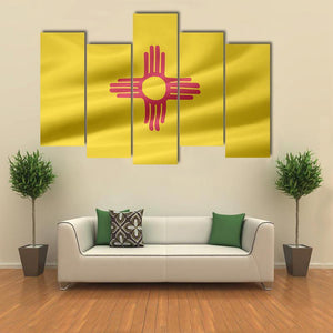 The Flag Of New Mexico Canvas Wall Art shows the New Mexico flag in a bold, graphic design, with its red sun symbol set against a bright yellow field. The composition emphasizes symmetry and a subtle wavy fabric texture for an iconic, graphic feel. Works well in modern house interiors and room decor that welcome a strong, simple statement piece.