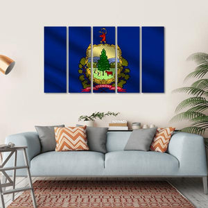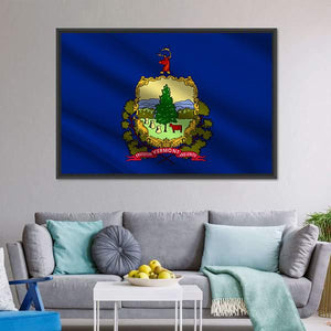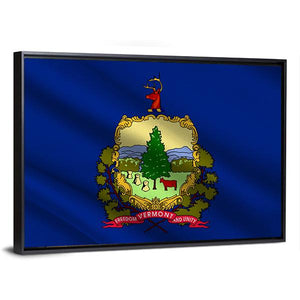 Celebrate Vermont's rich history with this canvas wall art featuring the state flag. Its vibrant colors—blue, green, red, and gold—create a striking, patriotic atmosphere. This artwork adds a touch of vintage charm to your space.