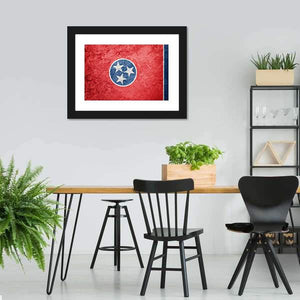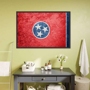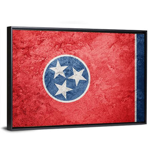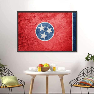 This canvas shows the Tennessee state flag in a modern, graphic grunge style with a textured, worn background. The symmetrical red, blue and white palette creates a bold, patriotic, and simple look that fits modern home wall decor.