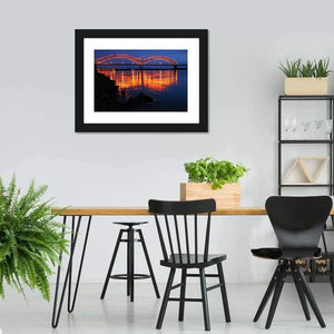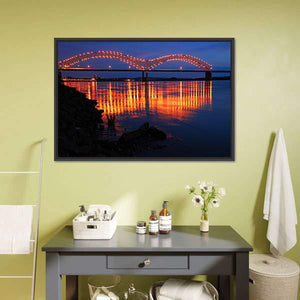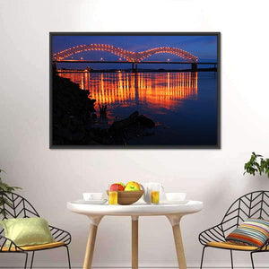 This stunning canvas art features the serene beauty of the De Soto Bridge at night, reflecting vibrant orange lights on the dark water below. Its modern style and striking palette of blue and black create a peaceful atmosphere, perfect for enhancing your decor.