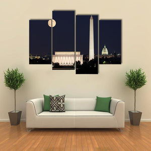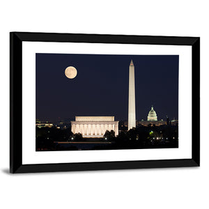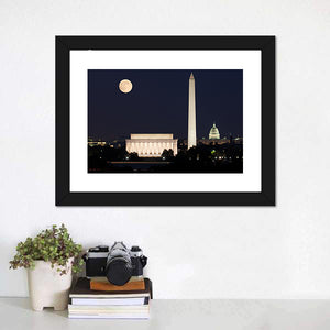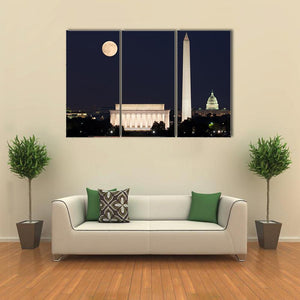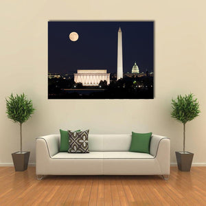 Full Moon Above Lincoln Memorial Canvas Wall Art depicts the Lincoln Memorial with the Washington Monument and the US Capitol beneath a full moon, rendered in a realistic nighttime landscape. Its dark blue, white, tan and green palette and calm, iconic mood suit modern living rooms or a home study.
