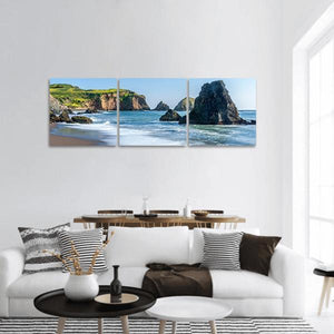 This panoramic canvas captures the tranquil beauty of Rodeo Beach in California, showcasing the ocean, rocks, and cliffs. With its serene color palette of blue, green, and brown, it brings a natural touch to your space.