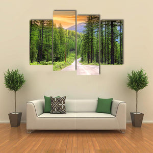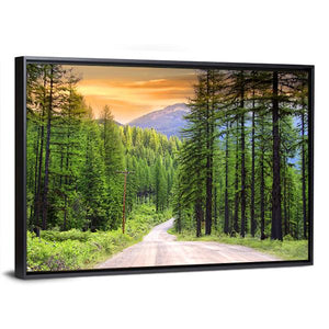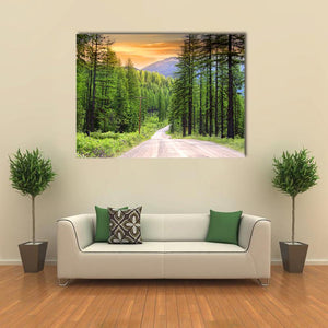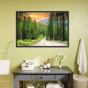 Explore a serene forest road surrounded by tall pine trees and majestic mountains under a warm sunset sky. This realistic canvas captures an adventurous spirit, perfect for nature lovers.