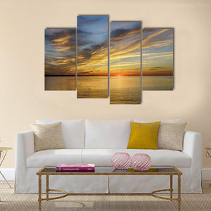 Sunset On Lake Ontario Rochester Canvas Wall Art depicts a sunset over Lake Ontario with a small boat on the water beneath warm gold and orange skies. The image uses a rule-of-thirds composition and a palette of orange, blue, yellow, gold and grey for a serene, peaceful yet vibrant, modern scenic mood that suits modern interiors and room decor.