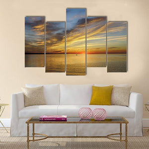 Golden Sunset Over Lake with Boat Silhouette Canvas Wall Art