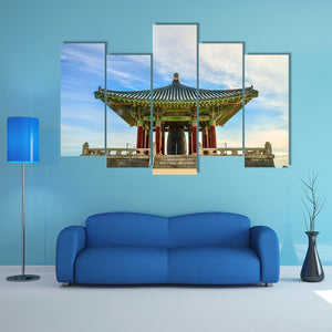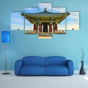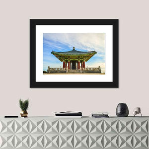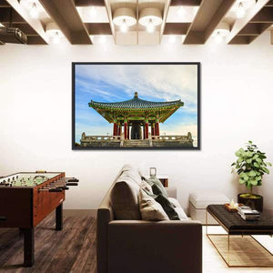 This canvas features the Korean Bell of Friendship with a nearby pagoda, centered at eye level and showing ornate roof detail and the bell. Rendered in a realistic landscape palette of green, blue, red and brown, it has a serene, majestic, traditional mood. It suits modern or traditional interiors seeking culturally resonant wall art.