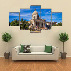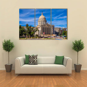 This canvas wall art features a photorealistic depiction of the Oklahoma State Capitol, showcasing its iconic dome structure amidst a sunny urban setting. The balanced composition highlights the symmetrical facade, accented by a clear blue sky and wispy clouds.