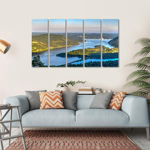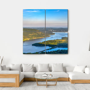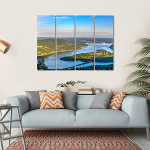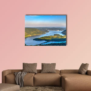 This landscape canvas art captures a serene aerial view of lush green mountains, a flowing river, and a charming bridge. The soft blues and earthy tones create a natural, expansive atmosphere that beautifully enhances any space.
